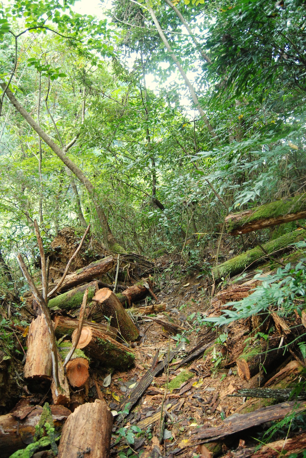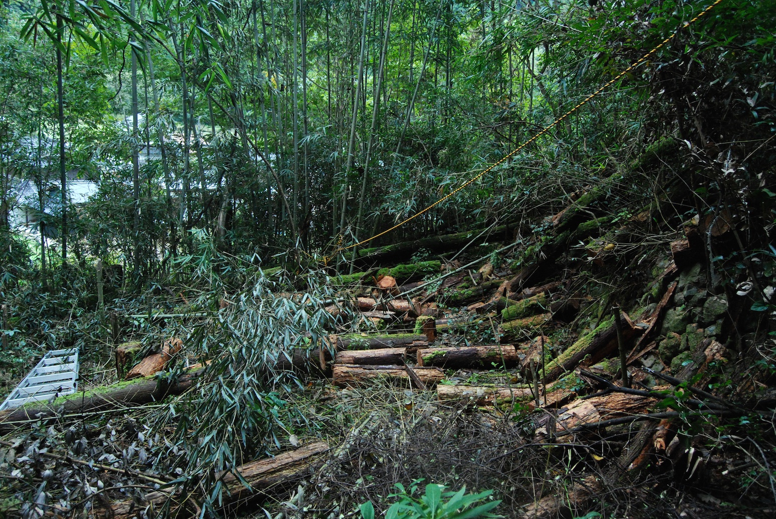 J’ai donc commencé à tronçonner les troncs effondrés qui bloquaient tout passage. Il commence à faire plus clair.