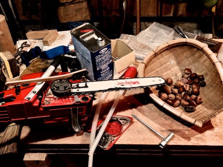 On en profite pour nettoyer la tronçonneuse, et en changer la chaine. J’avais aussi mis de côté des glands et des marrons, glanés le long des chemins, je vais tenter de les faire germer.