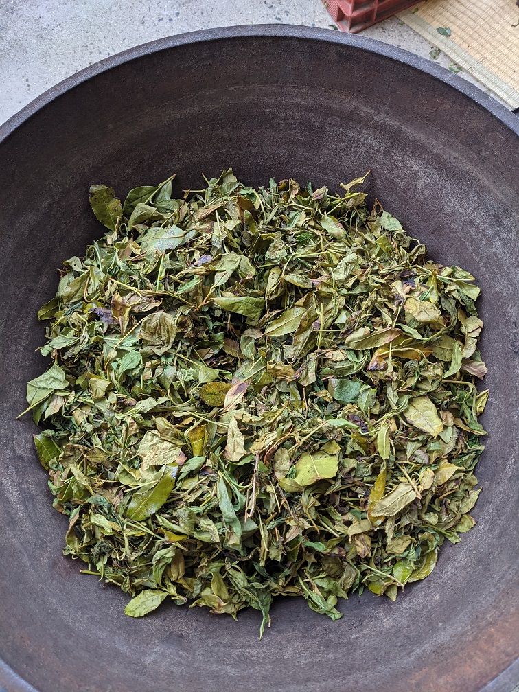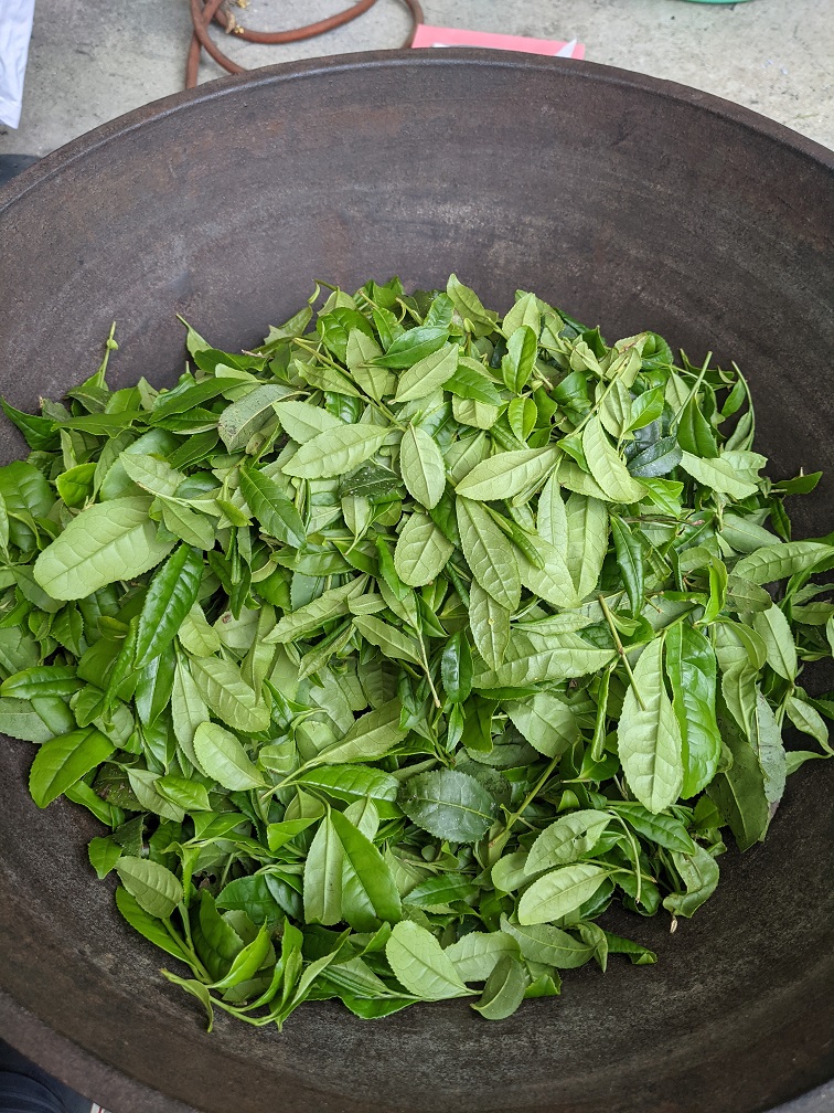 C’est que ces feuilles de thé toutes fraiches on les passe sur le feu au moins trois fois pour en faire partir l’humidité.