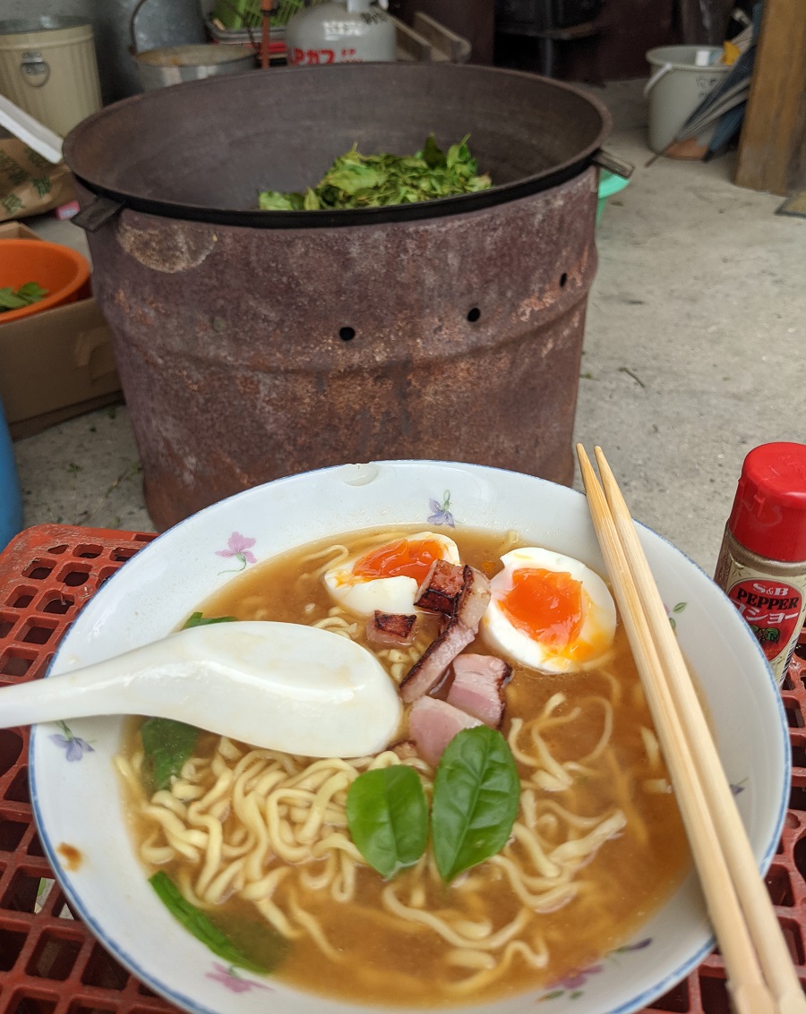 La femme de S. nous prépare un ramen ! Délicieux. J’ajoute deux feuilles de thé.