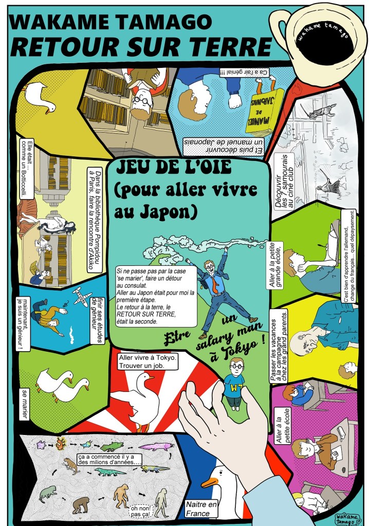 La première page de ma nouvelle Bande dessinée RETOUR SUR TERRE résume étape par étape, à la façon du jeu de l’oie, comment je suis allé vivre au Japon …
