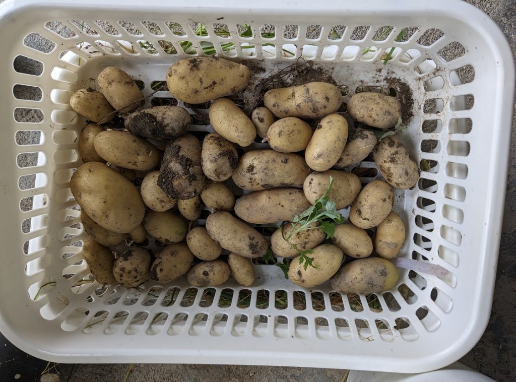 Ce sont les pommes de terre, que j’ai plantées fin février et que je commence à récolter …