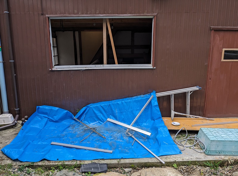 Samedi, je passe une partie de la journée à essayer de retirer les fenêtres (c’est à la japonaise, donc en fait c’est deux cadres de fenêtre qui coulissent librement), mais, le bâtiment a dû s’affaisser partiellement et le cadre de la fenêtre est déformé. Et donc il est impossible de retirer les cadres qui sont bloqués.