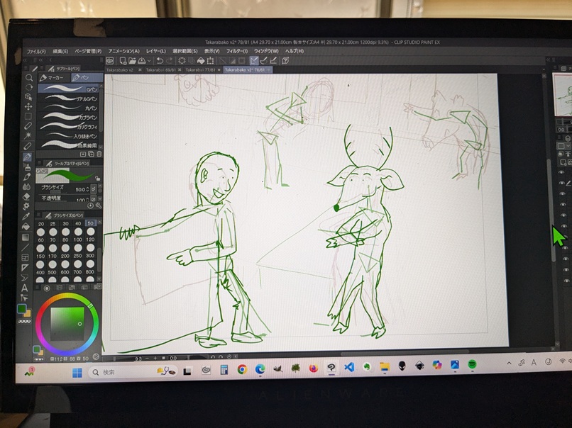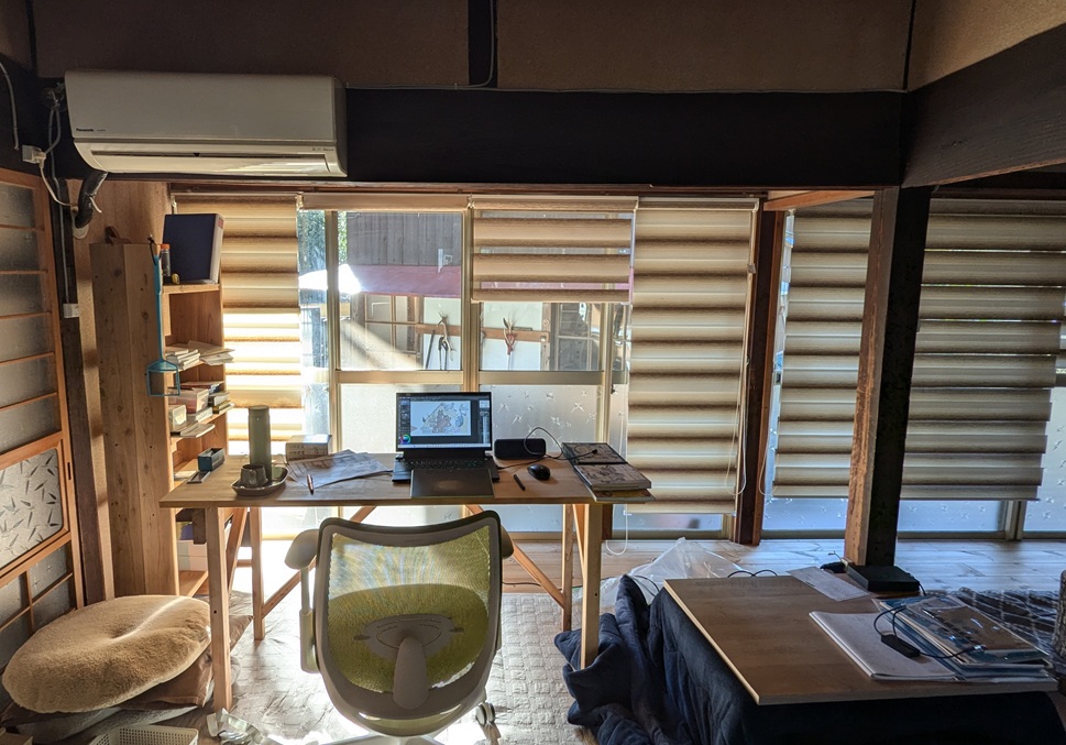 Jusqu’à maintenant soit je faisais mes BDs le soir dans la cuisine à la maison, soit dans mon bureau mais sur une table très basse. Maintenant, c’est beaucoup mieux, c’est pro….