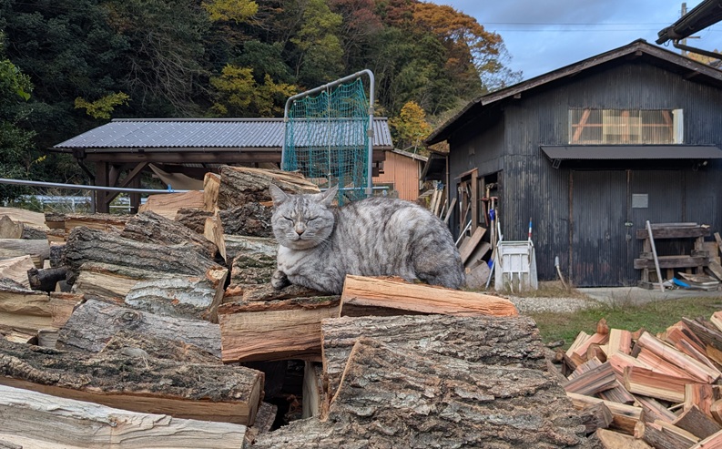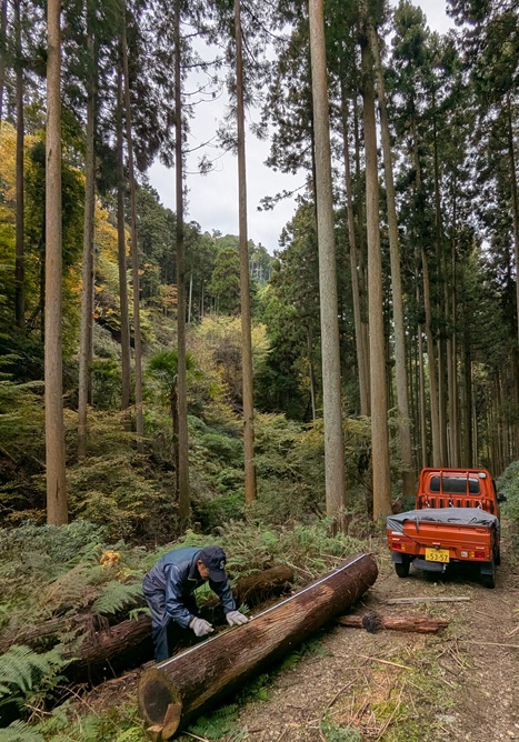 Cette semaine avec mon ami Saki Chan nous sommes allés chercher du bois en montagne. Un chemin forestier à moitié défoncé a été refait plus tôt cette année et pour ces travaux ils ont coupé beaucoup d’arbres, des cryptomères, rangés le long du chemin et Saki chan a eu l’autorisation pour les utiliser. Il suffit de les ramasser …