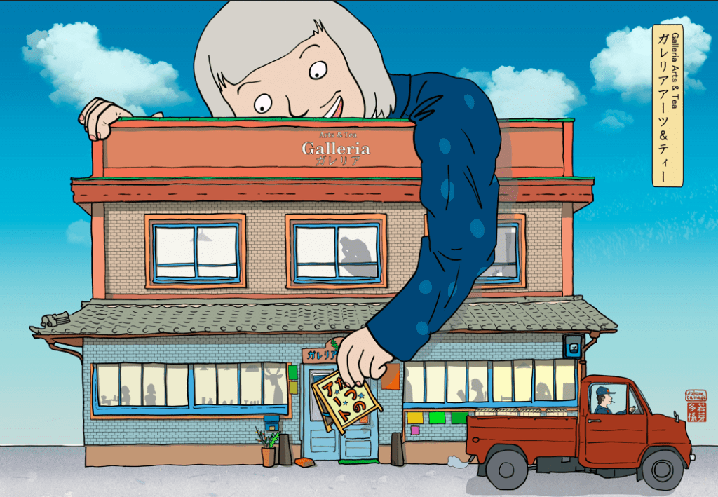 La géante qui surgit de la maison c’est Madame Mika, la gérante de Galleria. Elle est passionnée d’art et de culture.