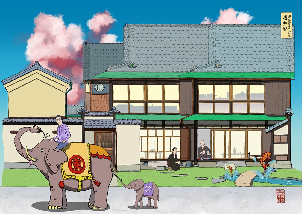 Il y a bien longtemps Higashimaru faisait des publicités en utilisant des éléphants, dans le dessin j’ai donc ajouté monsieur Asai, troisième génération de la famille … sur un éléphant.