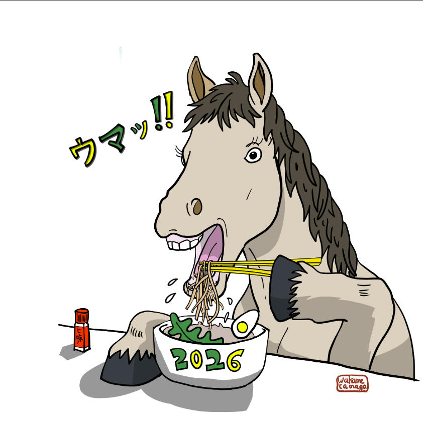 Fidèle à la tradition ici le cheval mange des nouilles de sarrasin soba pour passer de 2025 à 26, accompagnées d’algues wakame et d’un oeuf tamago. … mon nom d’artiste c’est Wakame Tamago…