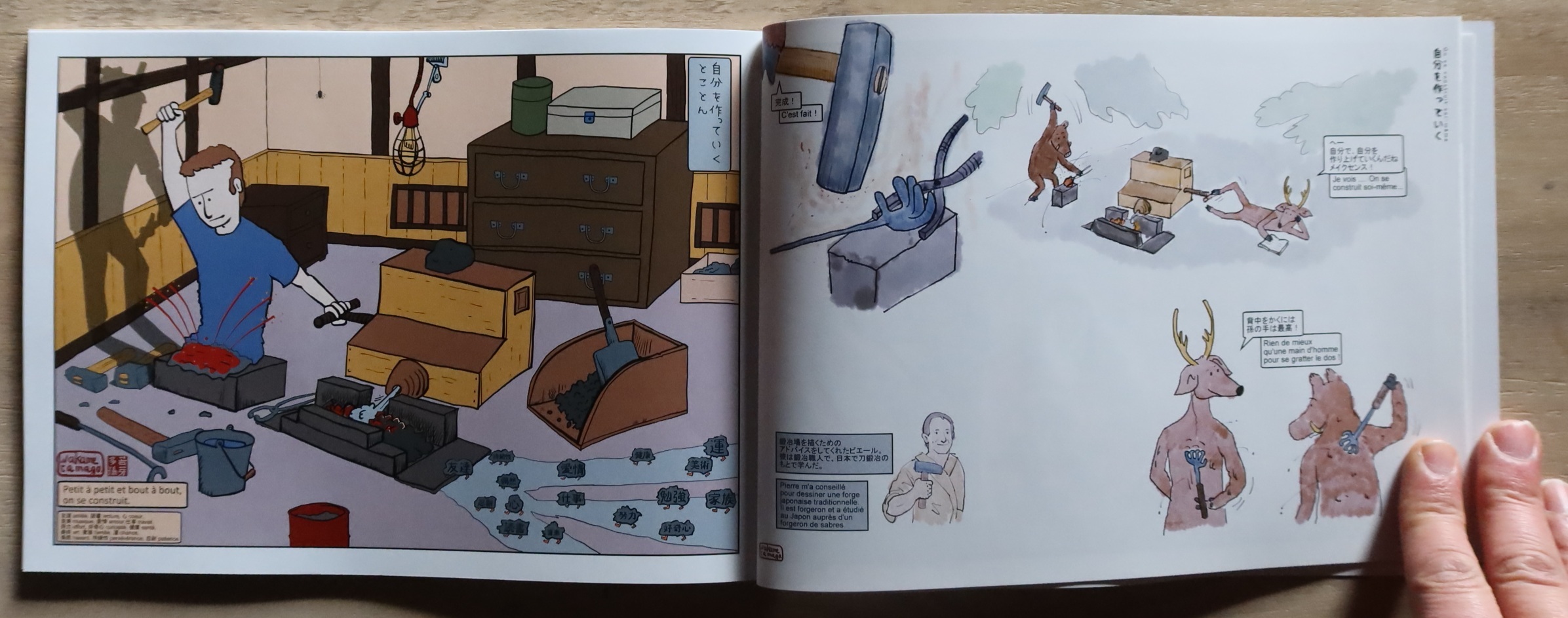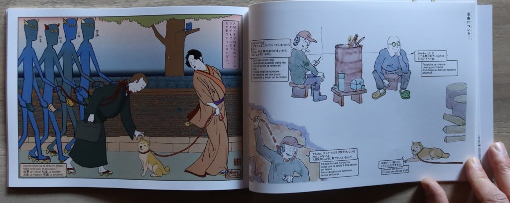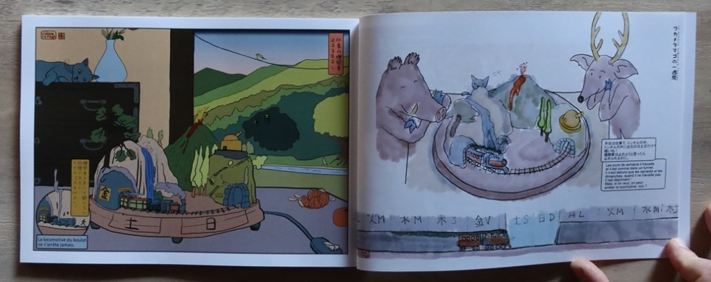 Chaque thème est « traité » sur deux pages, une page dans le style de l’ukiyoé où j’expose mon idée disons, et, en face, une page où les animaux de la forêt, le sanglier et le chevreuil répondent ou donnent leur version des choses…