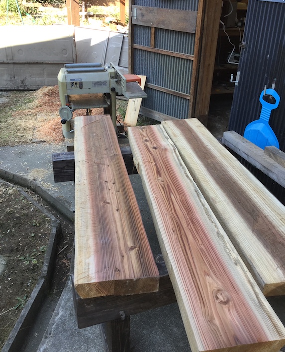 Puis entre en scène la tronçonneuse pour découper deux poutres. Qui viendront se poser sur chaque paire de piliers.
