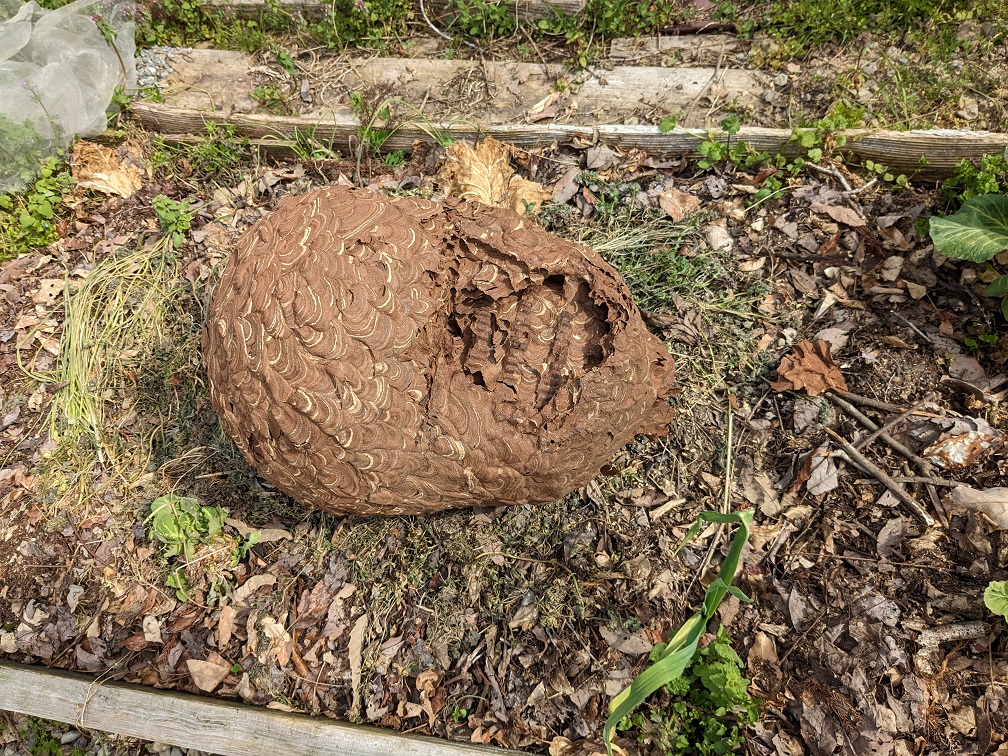 Les nids de frelons je les mets dans le potager, je me dis que la cellulose mâchée par les frelons va retrouver joliment dans la terre.