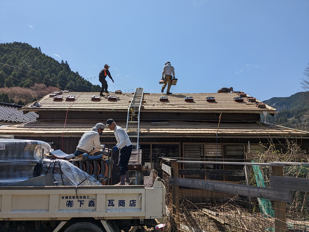 Hier c’était le deuxième jour des travaux et la majorité des tuiles sont déjà sur le toit.