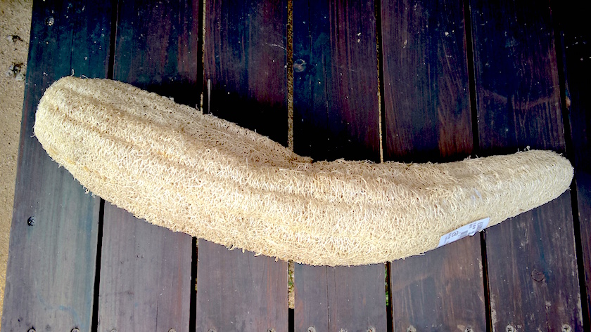 Achetés au supermarché, pour deux cents yens soit moins de deux euros, les fibres d’une courge héchima. Nous les couperons en tranches, et cela fera des éponges végétales et naturelles pour faire la vaisselle.