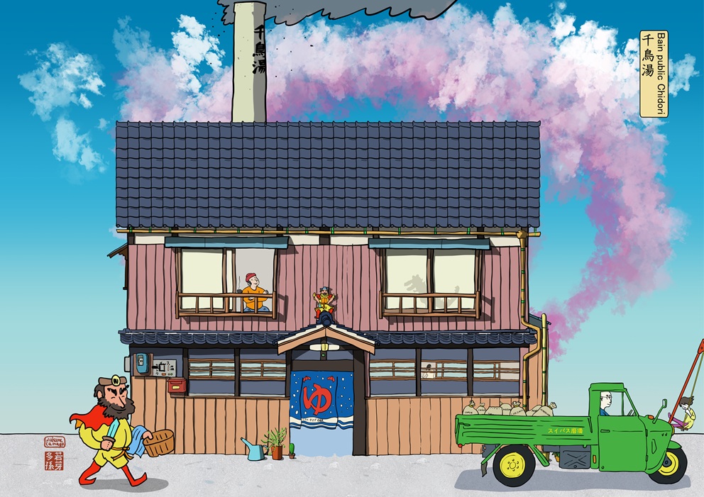 Le barbu en jaune c’est Shoki une divinité protectrice chinoise que l’on trouve très souvent sur les toitures des maisons à Kyoto par exemple. Le bain public – restau a un très beau Shoki juste au dessus de la porte d’entrée.