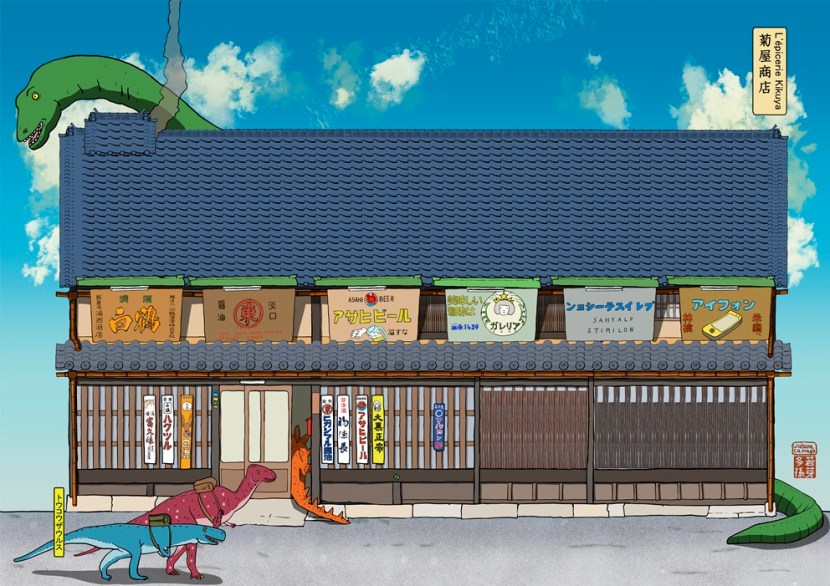 Sur le dessin Mr Asai Sekizō jeune, au centre, et à droite, plus vieux. Au premier étage j’ai représenté les silhouettes des usines de highashimaru au début du siècle au centre et aujourd’hui à droite.