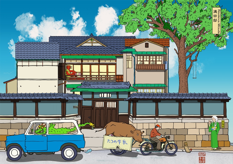 Il y a bien longtemps Higashimaru faisait des publicités en utilisant des éléphants, dans le dessin j’ai donc ajouté monsieur Asai, troisième génération de la famille … sur un éléphant.