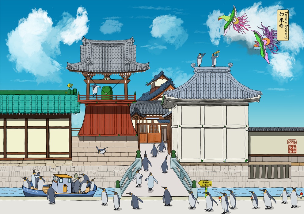 Le Pôle Sud est à plus de 13000 kilomètres avant de rentrer les pingouins font une petite prière au temple Nyoraiji.