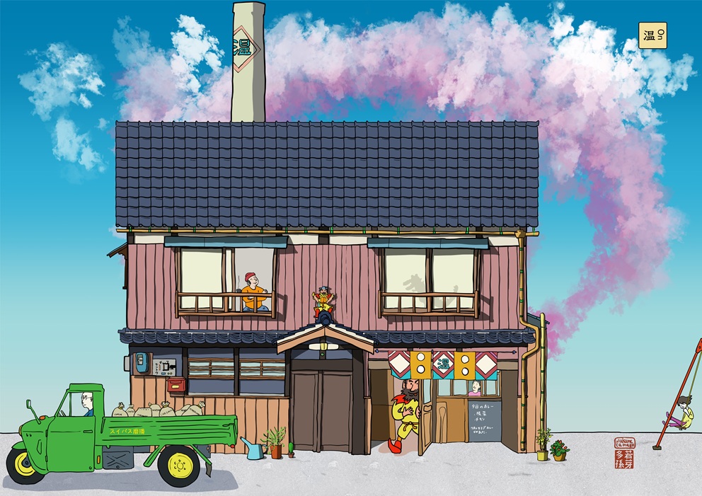 Le barbu en jaune c’est Shoki une divinité protectrice chinoise que l’on trouve très souvent sur les toitures des maisons à Kyoto par exemple. Le bain public – restau a un très beau Shoki juste au dessus de la porte d’entrée.