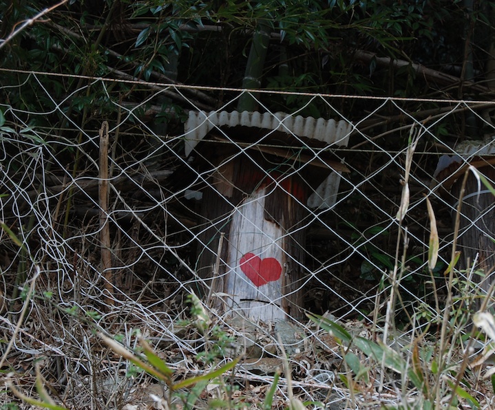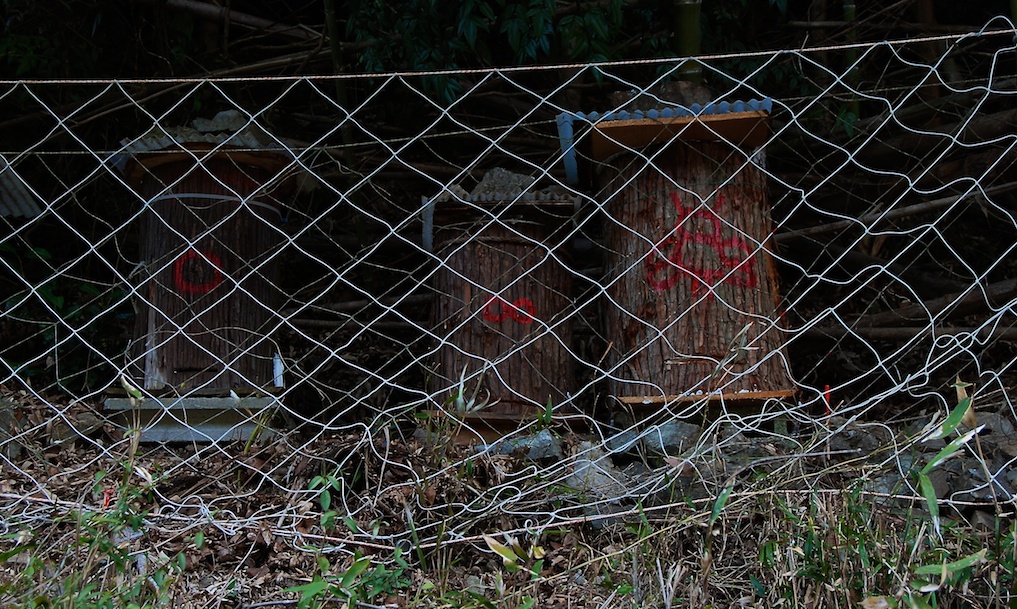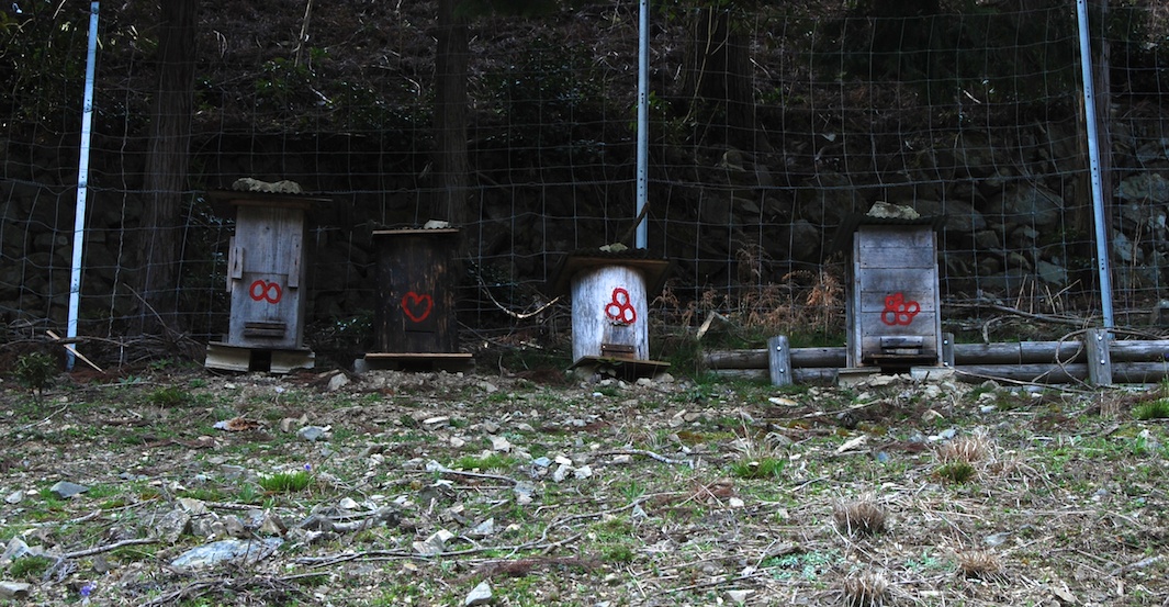 Le choix de l’emplacement d’une des trois ruches n’était pas très judicieux; elle est placée juste sur un sentier emprunté par les chevreuils 動物道. Ceux-ci risquent fort de la bousculer et de la faire tomber. Il faut donc la protéger avec un filet.