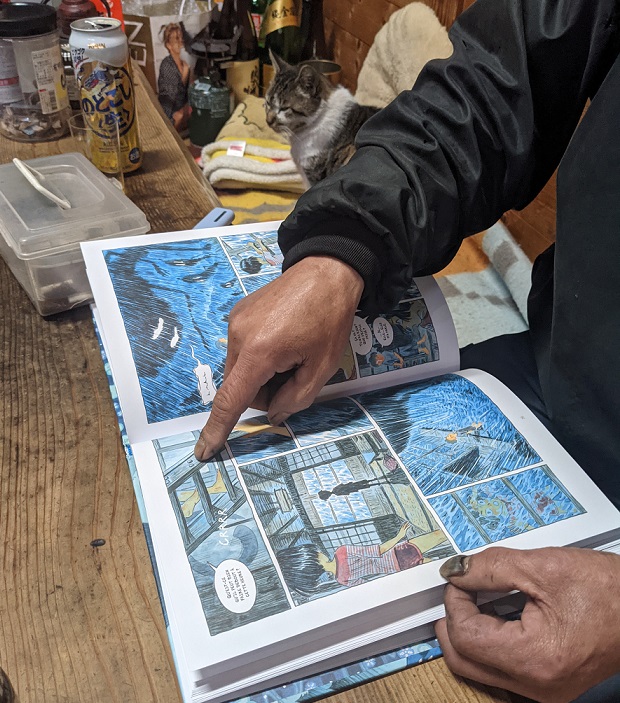 Je les suivais sur instagram avec intérêt depuis longtemps, et sur une de leurs photos insta ils montraient une petite bibliothèque qu’ils avaient conçue pour y mettre en valeur des livres sur la montagne et la nature. J’ai du ajouter un commentaire signifiant mon admiration pour ce projet, et leur réponse disait: ‘on voudrait bien ajouter ta bande dessinée 失われた田舎暮らしを求めて dans cette bibliothèque (la version japonaise de Retour Sur Terre– dont le titre japonais traduit littéralement signifie ‘à la recherche de la vie à la campagne perdue‘.)