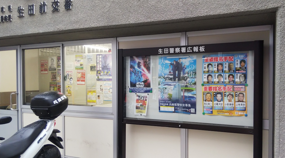 Au Japon il y a toujours ces étincelles d’incongru, d’inattendu. C’est ça qui empêche les synapses de rouiller. Comme ici devant un poste de police de quartier avec les posters des criminels en cavale, un poster de recrutement … et un de star wars.