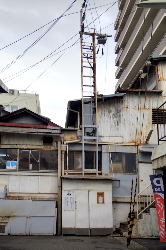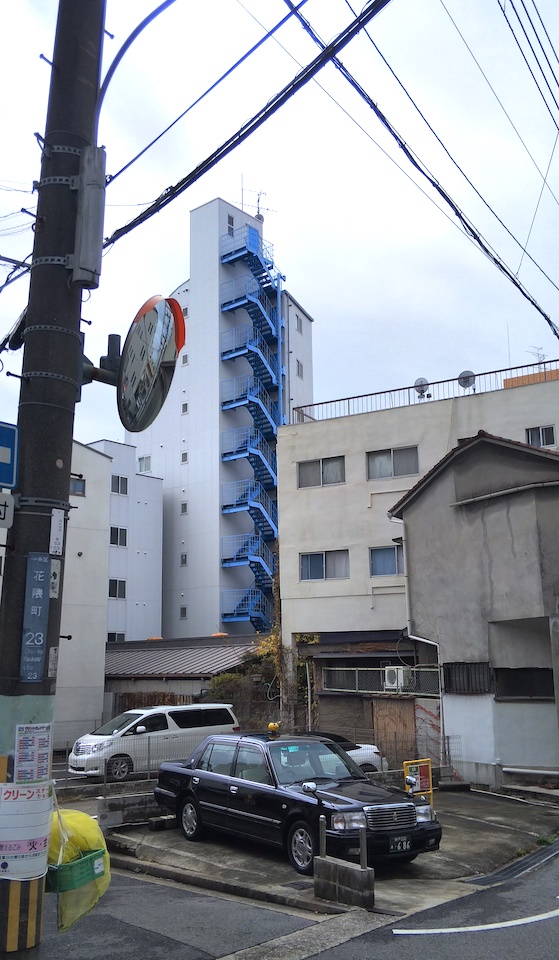 A propos de caméras de surveillance, si, au beau milieu d’un quartier résidentiel vous voyez un bâtiment protégé par une multitude de caméras de surveillance, bingo, il y a de grandes chances qu’il s’agisse de locaux utilisés par les yakuzas. Pas trop loin de ce poteau on voit d’ailleurs une de ces maisons. La présence d’une voiture de police confirme.