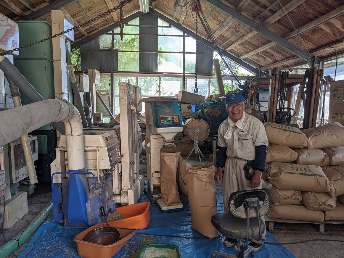 Revenons au riz. Il y a deux semaines je me balade et note le camion de monsieur F devant son hangar. Il y a du bruit et des fumées, je vais voir. Il s’occupe du riz qu’il a récolté. Monsieur F j en avais parlé brièvement il y a plusieurs années. On note que jusque dans les années 80 ou 90 il a vécu dans la fameuse maison de 1000 ans. Celle ci depuis a été transformée en musée. Sans doute la maison la plus ancienne du Japon.