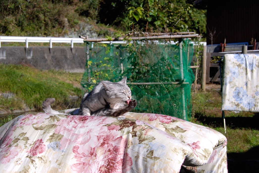 Le fukafuka et le pokapoka n’échappent pas à Minou qui se presse d’aller se hisser sur un futon et de faire une toilette poussée.