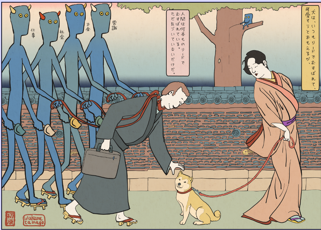 Et ici on voit en effet Wakame Tamago lui-même retenu par la laisse du travail 仕事, de la société 社会, du pognon お金, du système 常識.