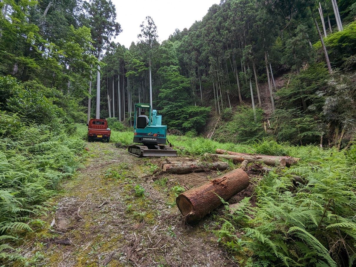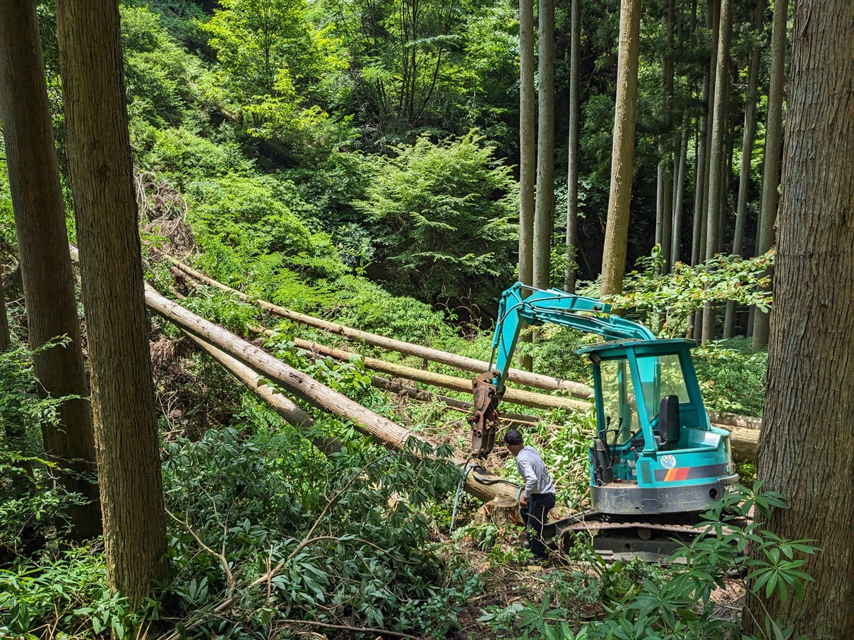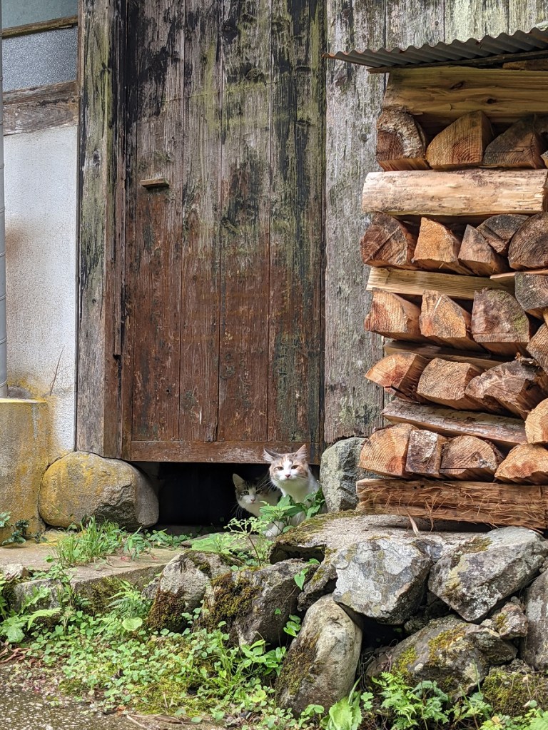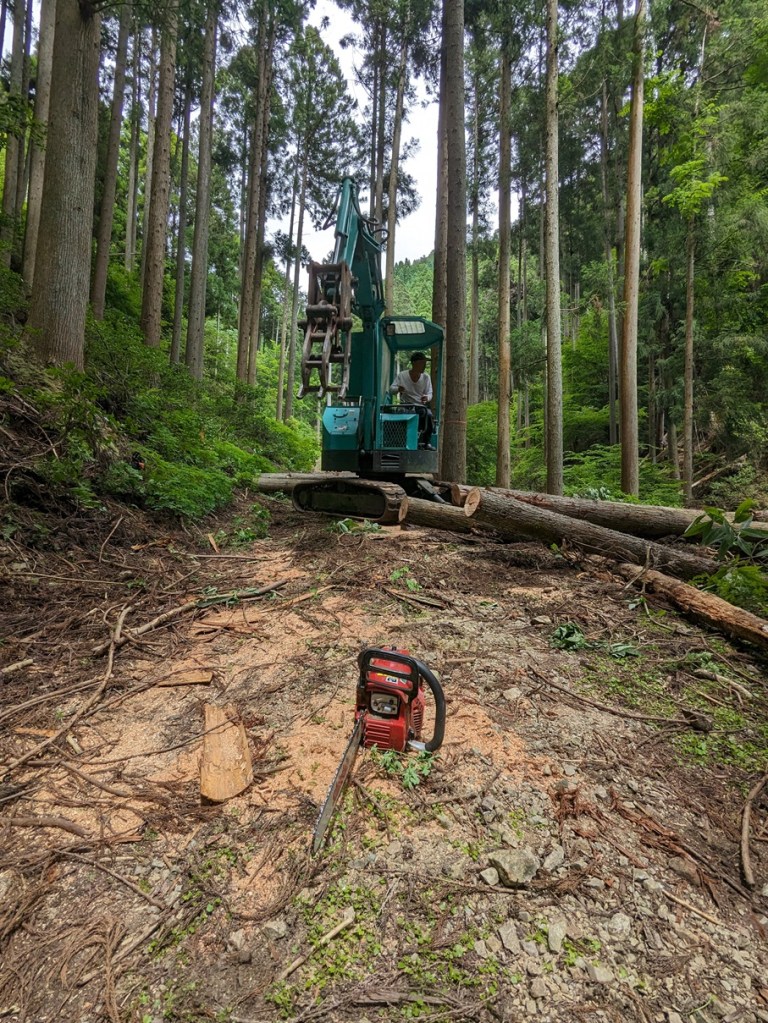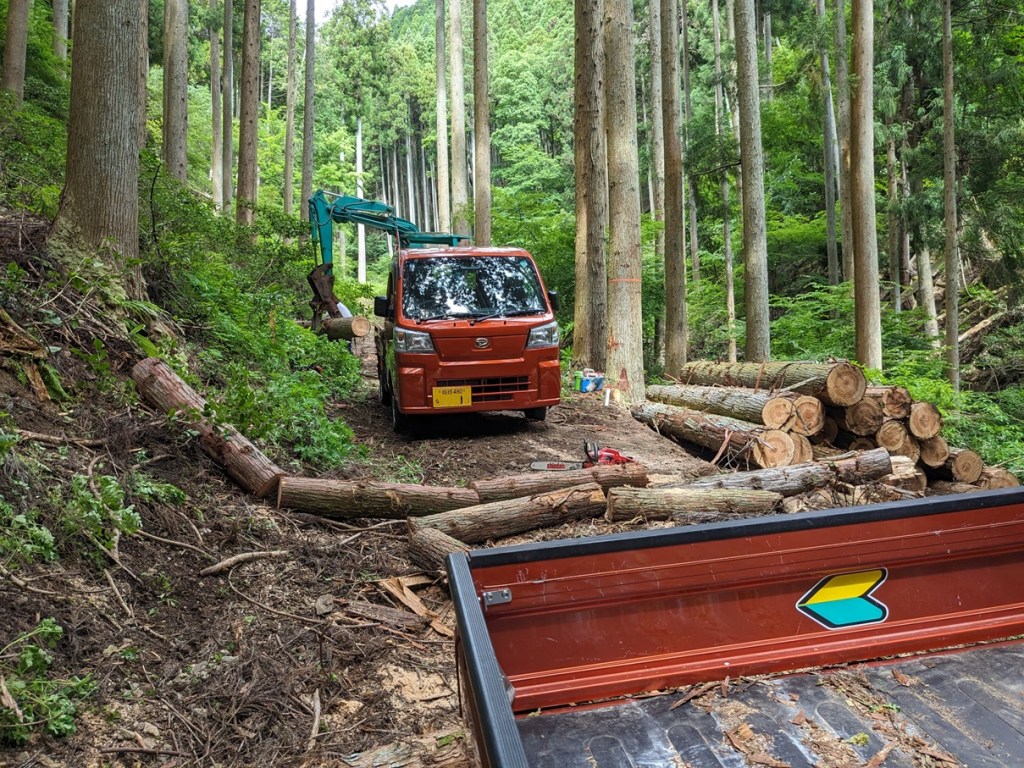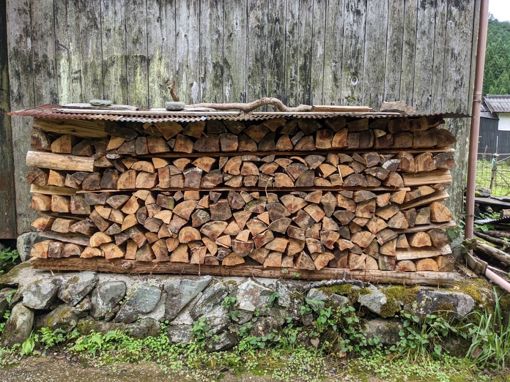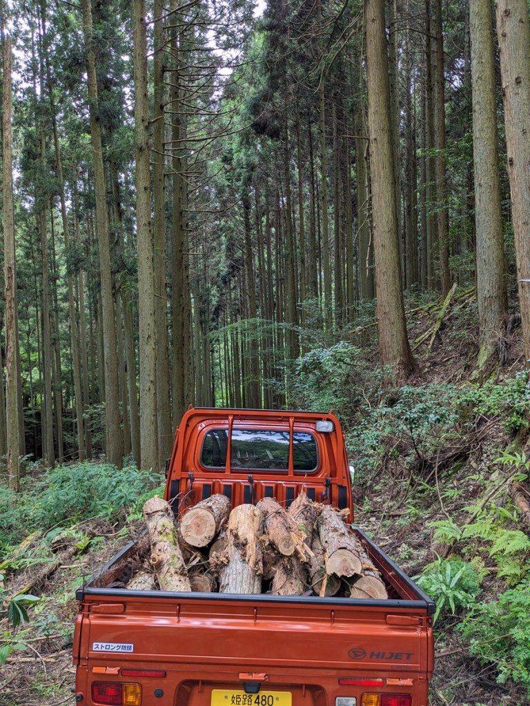 Cette semaine avec mon ami Saki Chan nous sommes allés chercher du bois en montagne. Un chemin forestier à moitié défoncé a été refait plus tôt cette année et pour ces travaux ils ont coupé beaucoup d’arbres, des cryptomères, rangés le long du chemin et Saki chan a eu l’autorisation pour les utiliser. Il suffit de les ramasser …