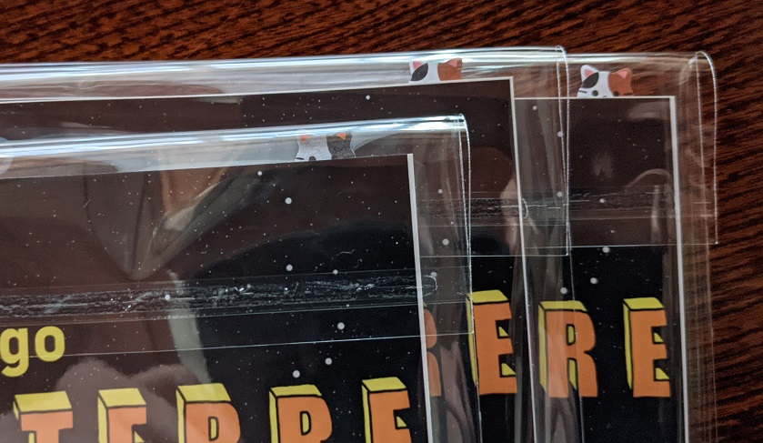 8 heures trente je retourne à la maison. Enfile un pantalon décent. Prépare une vingtaine de copies de la version JP de ma BD, je les mets dans une pochette plastique, ajoute un bandeau de papier explicatif. Sur une BD sur 10, je glisse un post it avec des oreilles de chat qui dépassent, pour faire la surprise, comme ici: