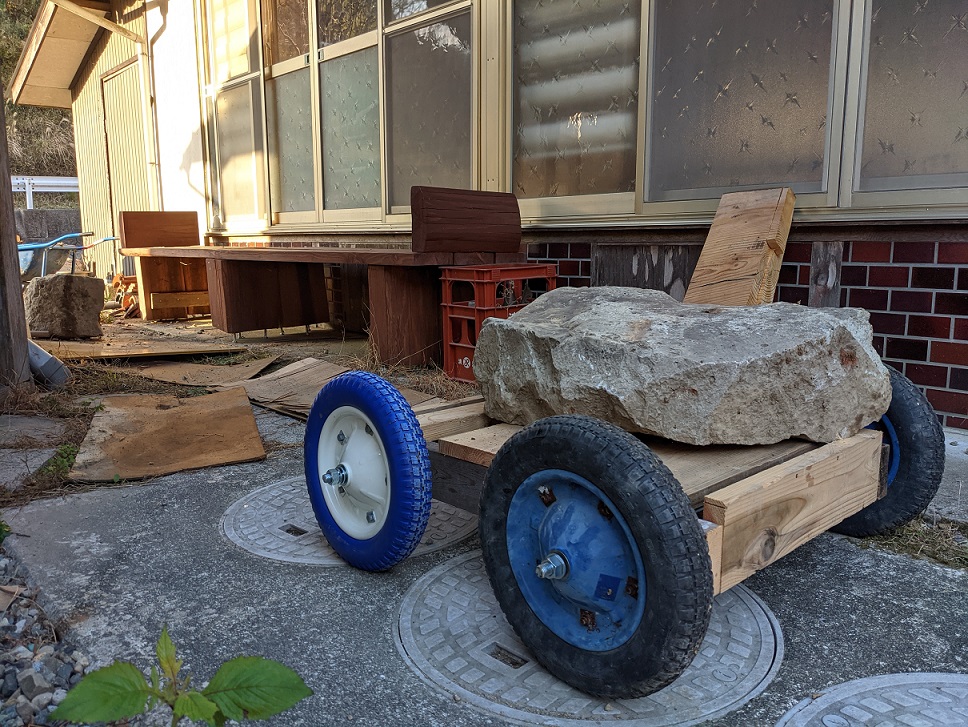 C’est bien joli de papoter mais j’ai besoin de bouger. Je remets ma tenue de combat et vais transporter de grosses pierres dans le jardin. Je les amène dans un petit coin où je fais comme une terrasse; cet endroit est sinon envahi de petits bambous et l’été c’est un cauchemar pour débroussailler. Pour transporter les pierres je teste un nouveau chariot bricolé récemment Ca marche très bien et c’est super pratique. Tout cela m’occupe pendant deux bonnes heures et je sue à grosses gouttes. Car il s’agit aussi de retirer de la terre; de la passer au tamis, d’amener cette terre dans le potager et de retirer de grosses racines pour pouvoir poser ces grosses pierres. Ce travail physique me fait un bien énorme.