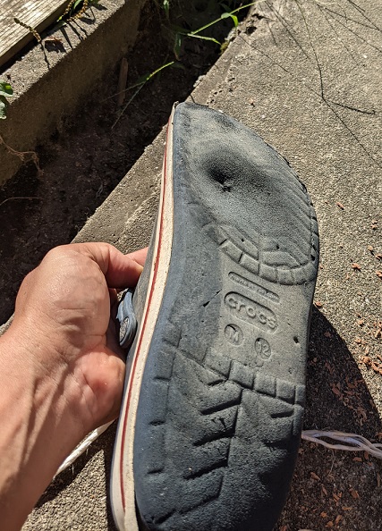 C’est que la semelle est usée mais je marche très peu avec les crocs, c’est à peine pour circuler entre la maison et le bureau… soit cinquante mètres …