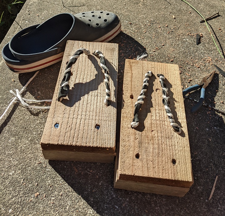Une planche de bois de cryptomère (d’un des arbres de ma montagne) et quatre bouts de bois d’une vieille palette, en pin. Je google quelques photos pour comprendre les proportions. Pose les pieds sur la planche de bois pour voir où couper et aussi où positionner les trous pour le cordon …