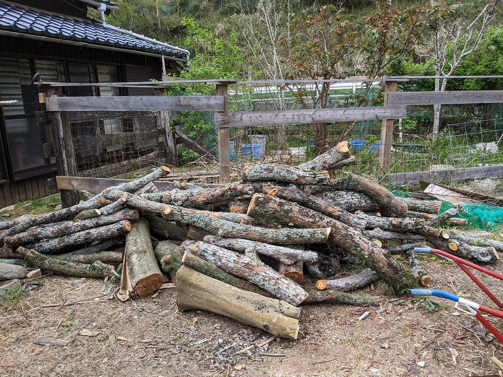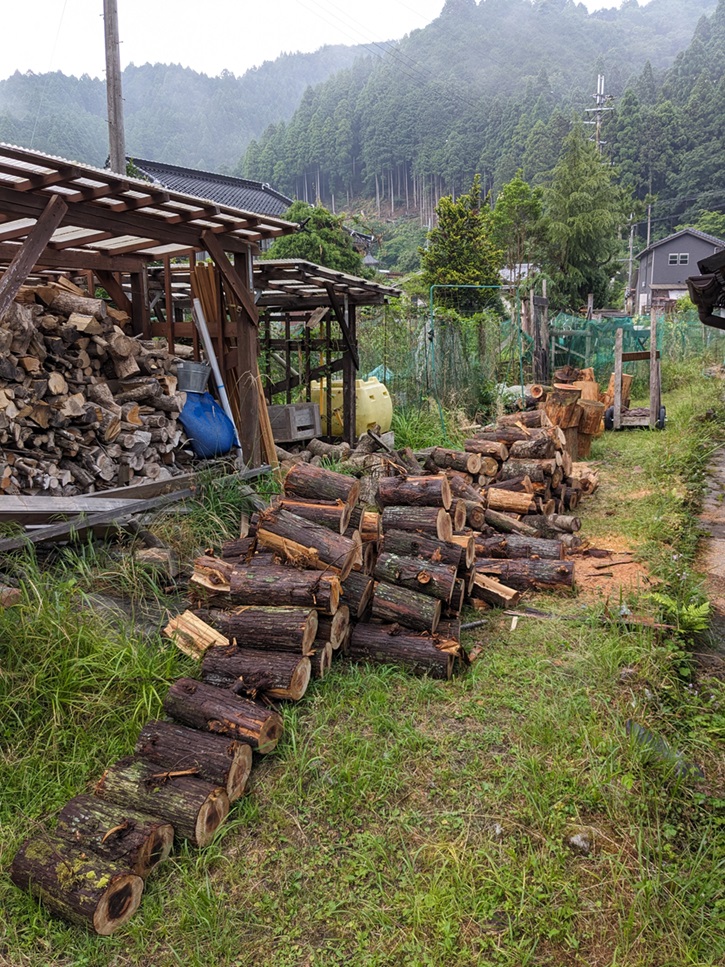 C’est vraiment une belle journée. Un gros effort physique aussi. Le bois Saki chan va l’utiliser pour faire des fagots, qu’il vend au camping du village. Tous les morceaux qui ne lui conviennent pas; trop gros ou trop petits, conviendront très bien à notre poêle à bois, Calcifer. Je charge 5 camionnées … C’est du volume …