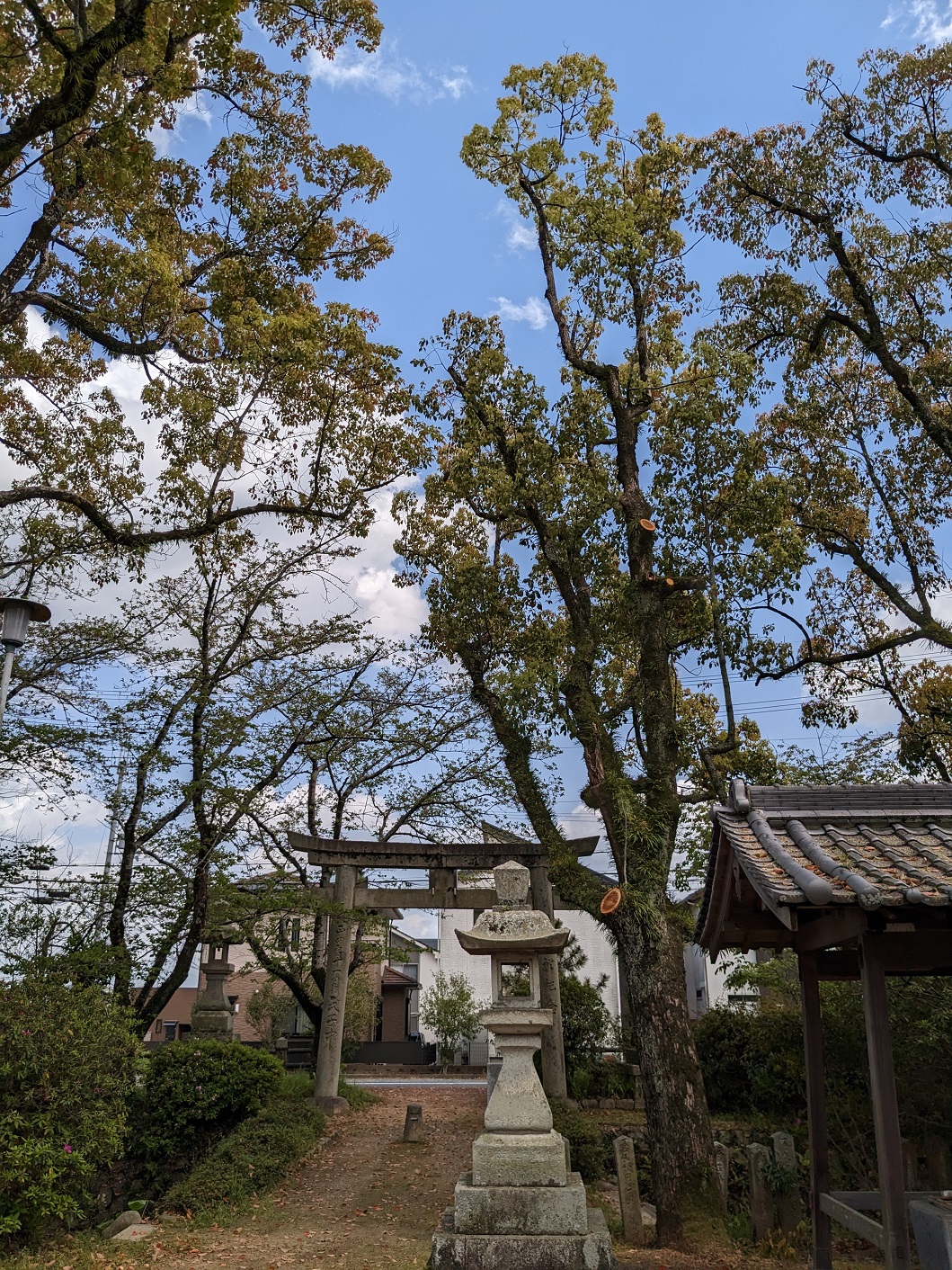 Ici c’est l’entrée du sanctuaire avec le tori-i. On discerne de belles branches coupées … Calcifer va les manger…