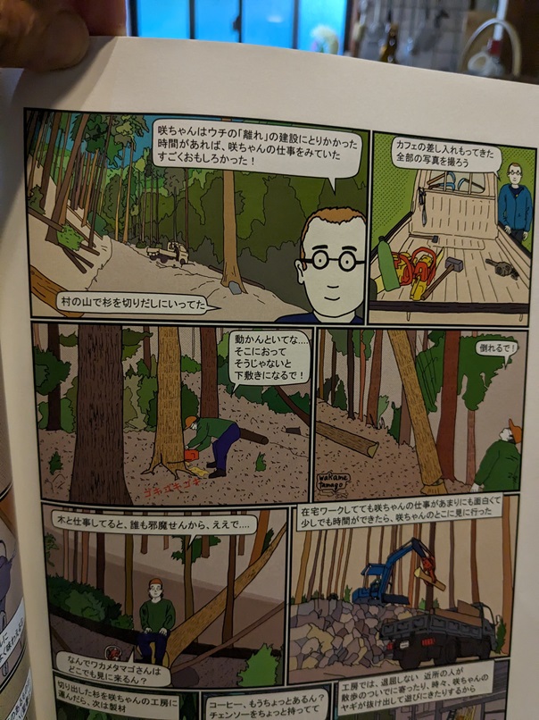 Ce lieu, je l’avais dessiné dans ma bande dessinée car il y a plusieurs années j’étais allé apporter du café à Saki chan qui était en train de couper des cryptomères pour construire une maison.