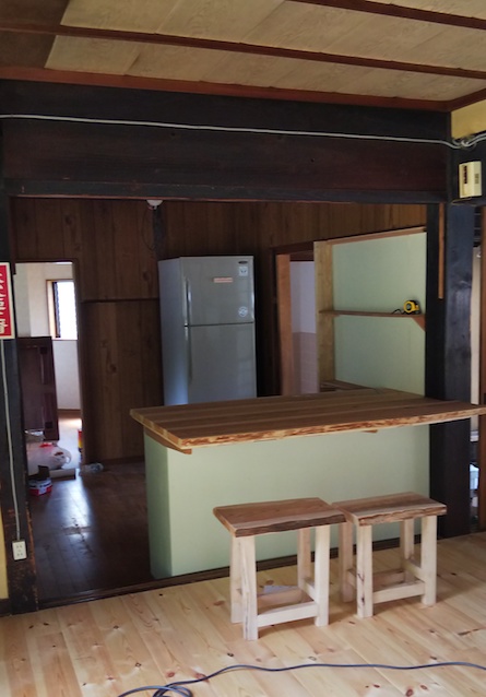 Le plancher ayant été refait, le projet actuellement en cours pour la remise en état de la petite maison; c’est le rafraichissement de la cuisine.