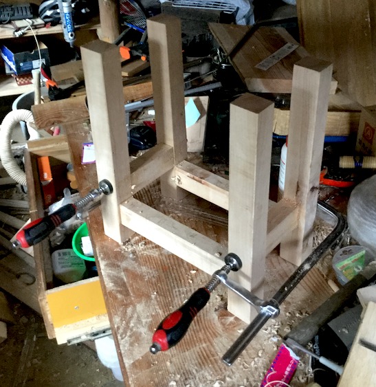 Même pour un petit tabouret il n’est pas évident de faire un truc parfaitement de carré. Plus tard je m’aperçois que le guide que j’utilise pour la scie circulaire impose une inclination à la lame de la scie …. ha … le moteur de la scie est trop bas ou le guide est trop haut … donc les angles ne sont pas bons…