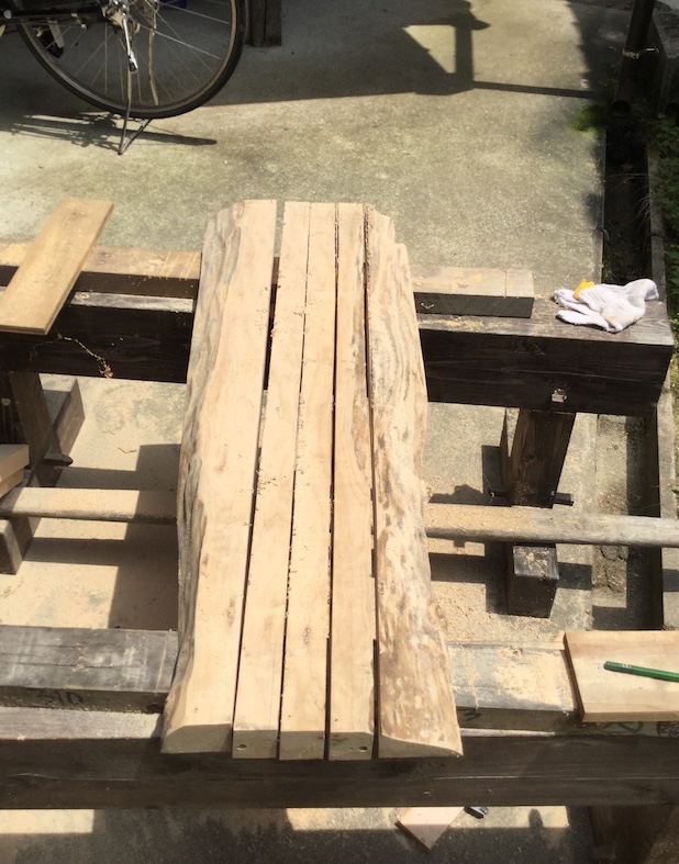 Pour fixer les pièces de bois j’utilise des goujons (ダボ). Après c’est histoire de patience pour coller le tout.