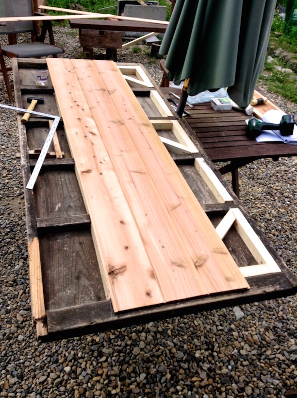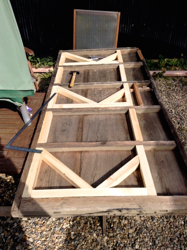 Puis je cloue des planches, des planches à plafond, afin de consolider le tout et de cacher les structures en équerre.