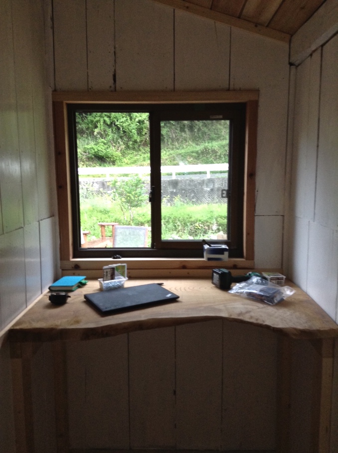 Ensuite vient la partie la plus fun avec l’installation du bureau. On utilise une belle planche de Kéyaki, achetée une bouchée de pain l’année dernière à foire de négociants de bois. Je pose le bureau assez haut (90cm) pour pouvoir travailler debout.