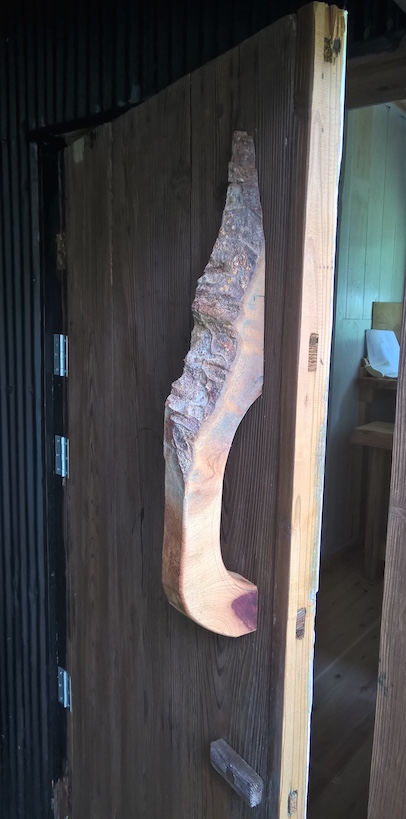 La porte de la cabane dans l’atelier ne ferme pas et est dans un très mauvais état. A la regarder de près elle est plus ancienne que l’atelier. Elle a du être récupérée, déjà, à l’époque.