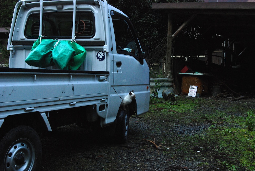 J’aperçois le camion d’un villageois, arrêté près de l’ancien élevage de poulets. C’est un habitué. Il vient voir les chats tous les jours. L’homme est très discret et ne veut pas que je le photographie. Les chats eux sont moins timides.
