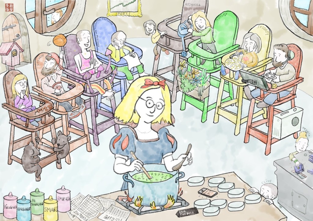 J’avais eu cette idée de nous dessiner en bébés nains de blanche neige (la chef) pour montrer combien ‘elle s’est occupée de nous’ et aussi (sens à moitié caché) elle nous a gavés de boulot à n’en plus finir…