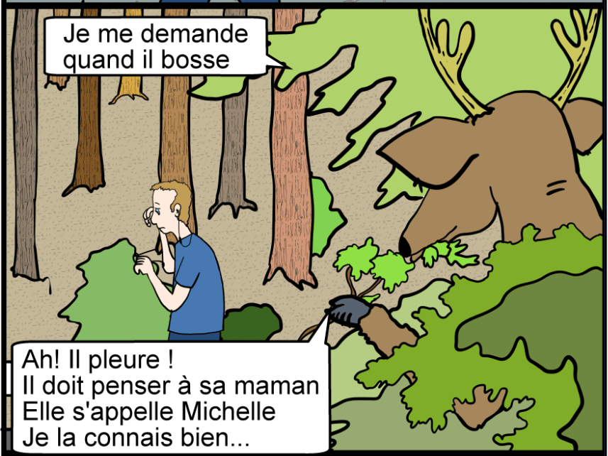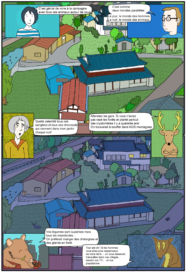 Je montre le résultat à mon épouse qui me conseille de réfléchir un peu plus, et je demande alors aux animaux de la forêt, le chevreuil et le sanglier de la BD précédente, Retour Sur Terre, de m’aider …
