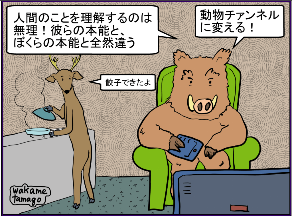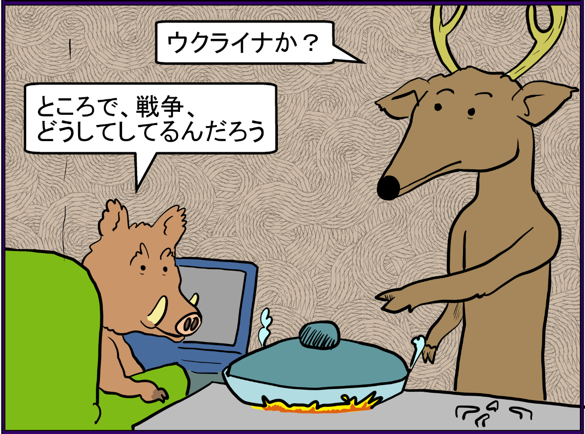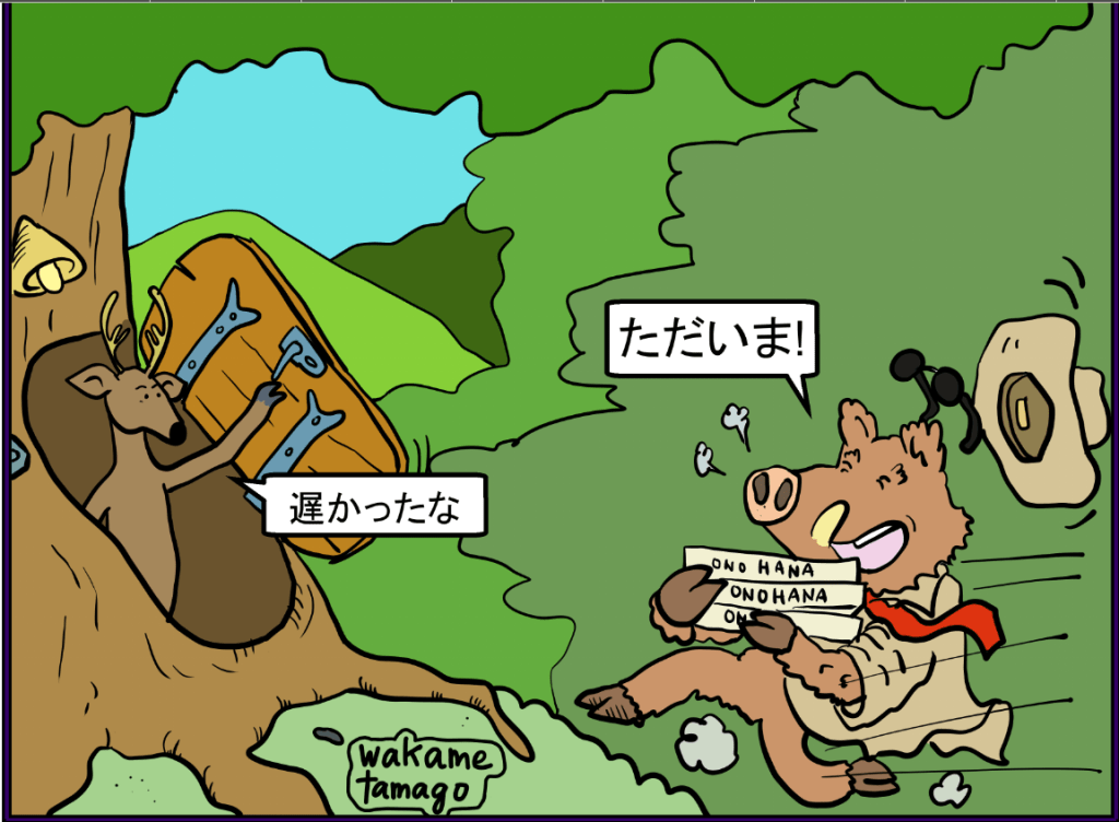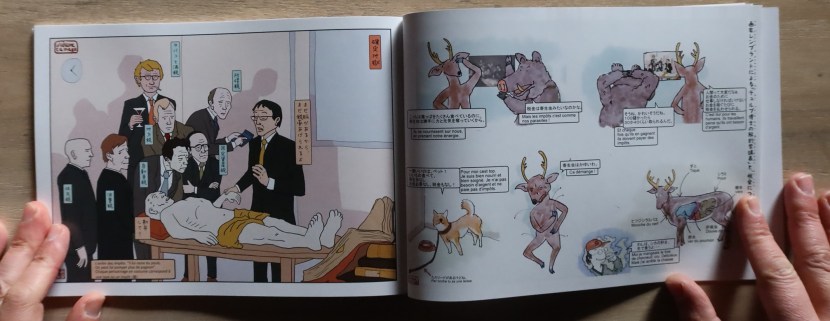 Sur la page de droite, un dessin dans le style de l’ukiyoé, sur la page de gauche, les commentaires, remarques, par le chevreuil et le sanglier.