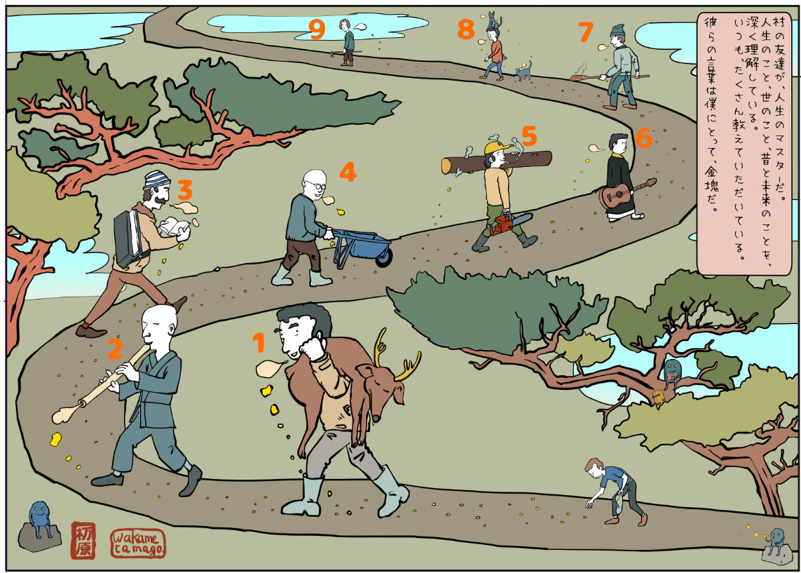 Mon épouse est vraiment mon 編集者, rédactrice … tout seul je n’y arriverais pas. C’est elle qui m’a fait refaire la dernière page plusieurs fois et m’a donné l’idée du dialogue final …