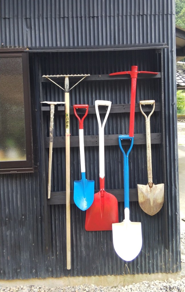 J’essaie de faire mes propres outils. A gauche la lame d’une petite serpe en acier inoxidable achetée pour trois cents yens (soit 1300 anciens francs) que j’ai fixée au manche (long) d’un ancien outil. Je l’utilise pour retirer les mauvaises herbes.