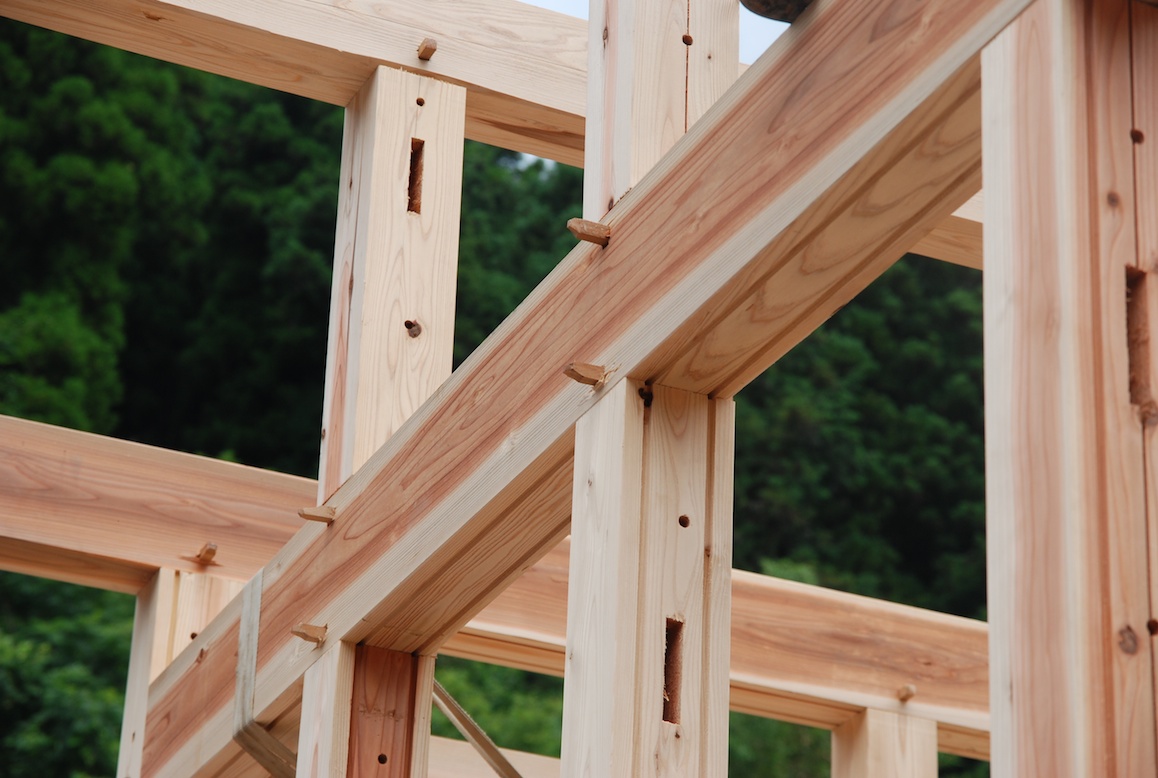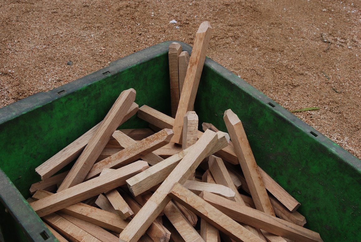Il y a deux très belles pièces, deux troncs d’arbres qui vont s’asseoir et lier les sommets des deux façades. Ils supporteront la toiture.